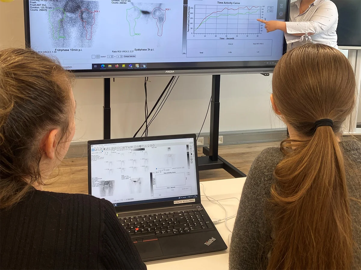 The students first acquire a theoretical understanding of nuclear medicine investigations and learn how to analyze them. In the second step, the students practice independently using Hermia software.