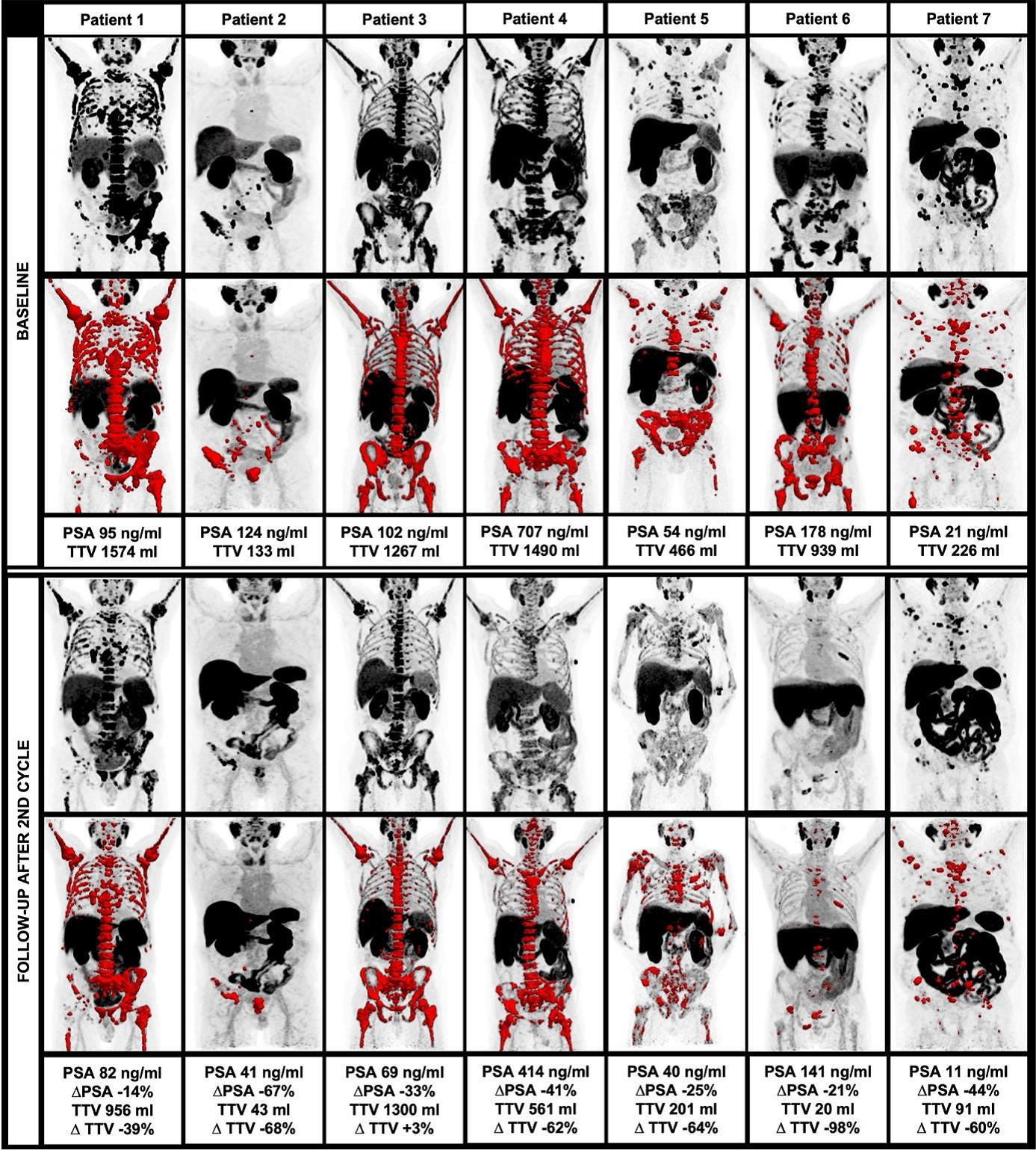 MCRPC patients undergoing RLT with 225Ac-PSMA-I&T with available 18F-PSMA-1007 PET/CT prior to therapy initiation were included. TTV was assessed in all patients using established cut-off values. Image derived, clinical and biochemistry parameters (PSA, LDH, AP, pain score) were analyzed prior to and after two cycles of 225Ac-PSMA. Changes in TTV and further parameters were directly compared and then correlated with established response criteria, such as RECIST 1.1 or mPERCIST.