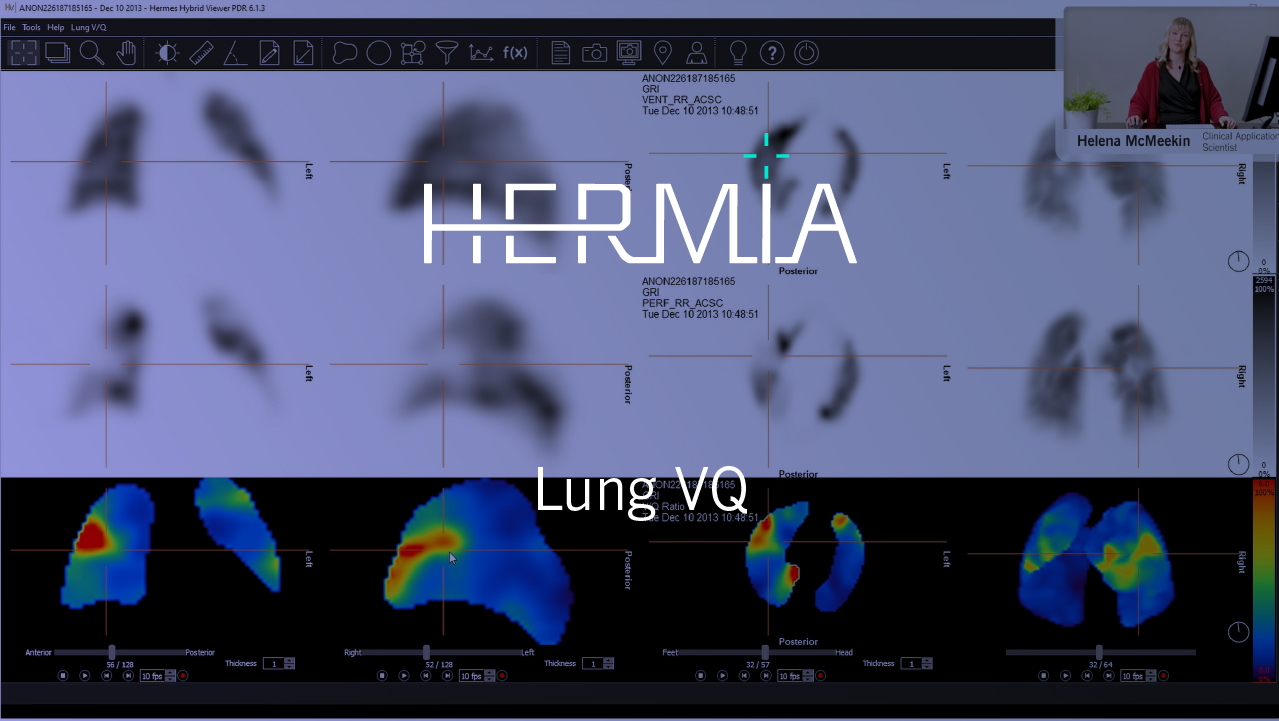 Welcome to a demonstration of the HERMIA Pneumology VQ by our Clinical Application Scientist, Helena McMeekin. It provides you with optimised tools for assessing Lung SPECT images: automatically co-register, normalise and filter the Ventilation and Perfusion data quickly and with ease. Enjoy the watch!