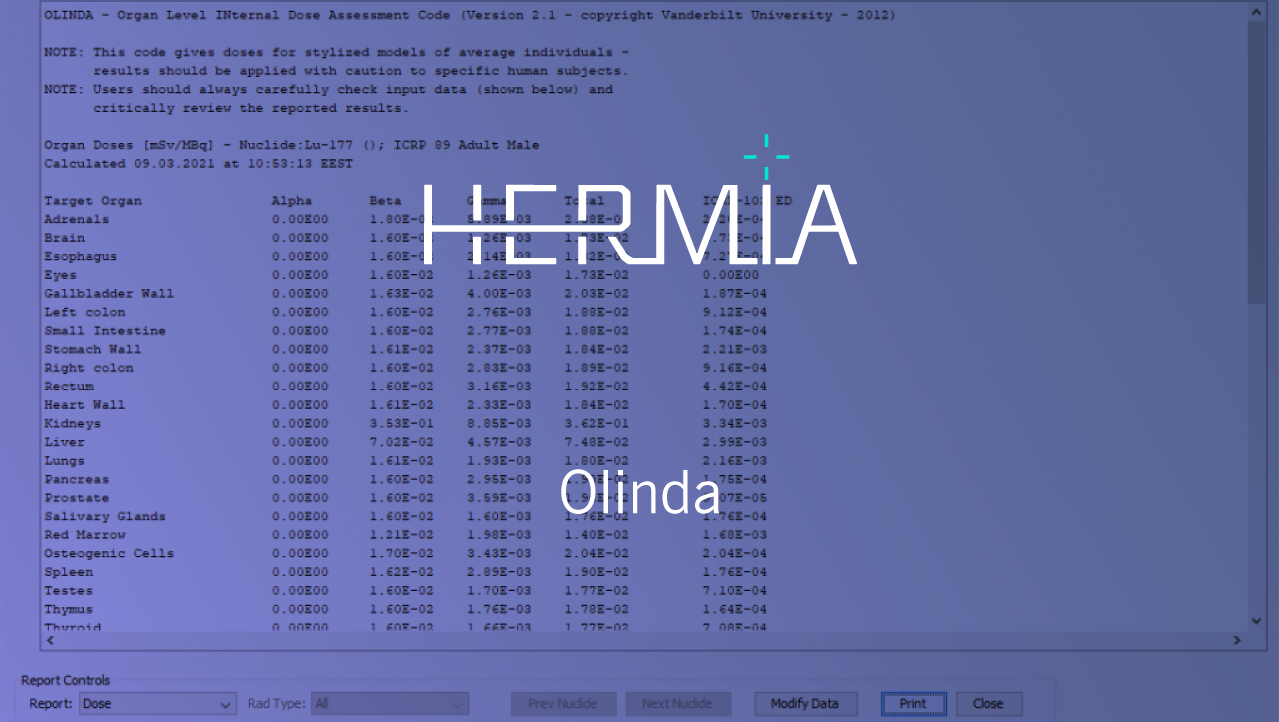Olinda is the most widely used software for standardized dose calculations for diagnostic and therapeutic radiopharmaceuticals. The program calculates the absorbed radiation dose to various organs according to the MIRD (Medical Internal Radiation Dose Committee of the Society of Nuclear Medicine) technique.